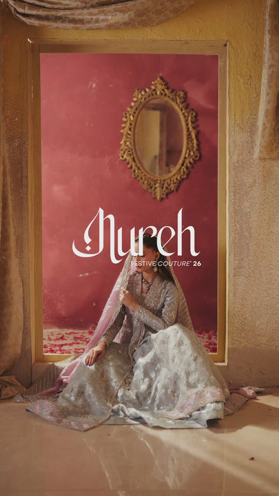 Mesmerizing icy blue pure dumzari angarkha, intricately embellished with zardozi and 3D flower patels, exuding regal charm. Paired with a luxurious jacquard silk lehenga, adding depth to the ensemble. The pièce de résistance is the pure silver Dumzari dupatta, lavishly adorned with embroidery and zardozi work.