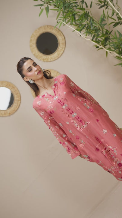 A floral embroidered shirt with delicate cutwork details, crafted on premium Khaddi silk fabric. Paired with pure striped organza for a refined, elegant finish.