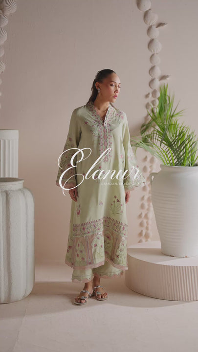 Embrace the aura of vintage royalty with our Pastel Mint ensemble, a breathtaking tribute to grand heritage and meticulous craft. This piece features majestic Mughal-inspired motifs, intricately embroidered and elevated by luxurious tissue silk patch work on both the shirt and pants for a rich, multidimensional texture. The look is perfectly harmonized with a coordinating tissue silk patch work dupatta.