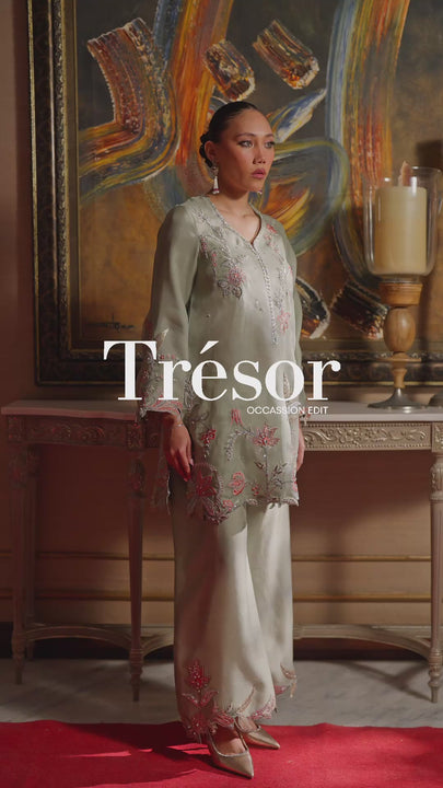 This elegant sage pure organza ensemble showcases delicate embroidery and leather appliqued enhanced with 3d work. The ensemble is further enriched with intricate 3D, beaded, and crystal work adding a touch of luxury. It's completed with detailed fi nishing touches and comes with matching embroidered culottes.