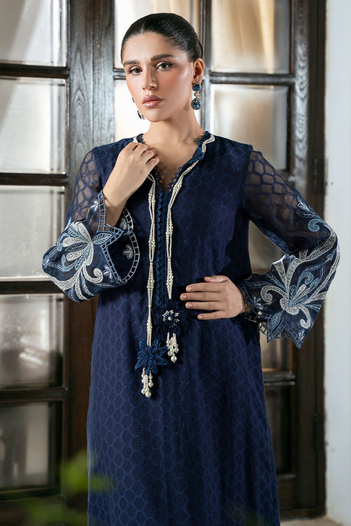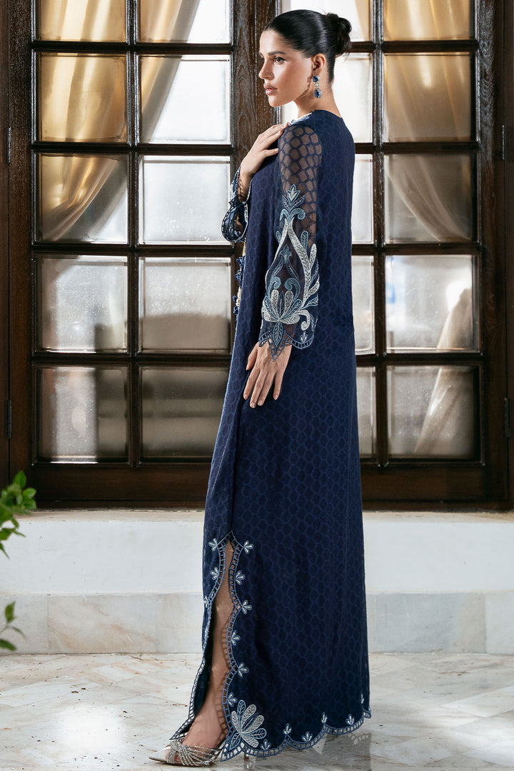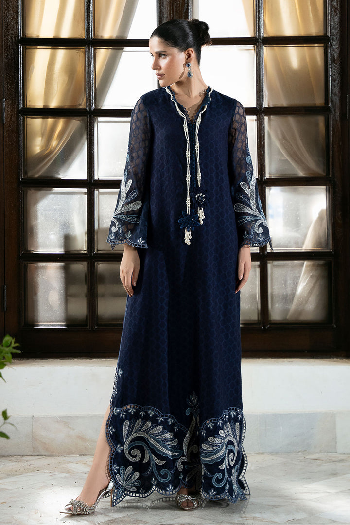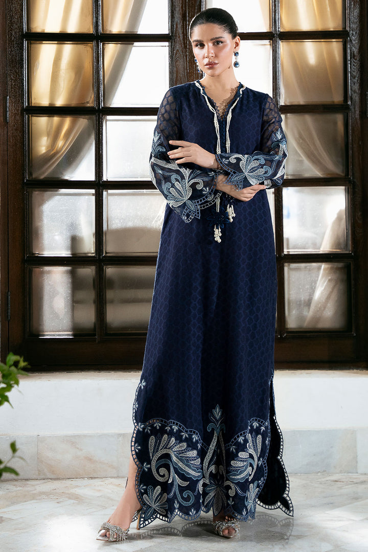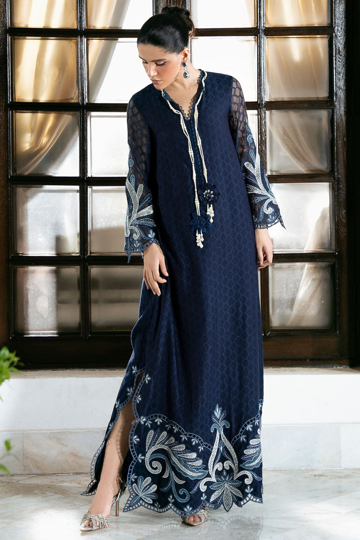 This stunning Navy Blue Cotton Net Kaftan offers a blend of breathable comfort and sophisticated glamour, making it an ideal choice for any elevated evening event. This silhouette is beautifully brought to life with meticulous silver tissue silk appliqué detailing, which provides a rich shimmer against the sheer fabric. The luxurious look is further enhanced by intricate cutwork embroidery and is gracefully finished with dainty pearl tassels along the borders.
