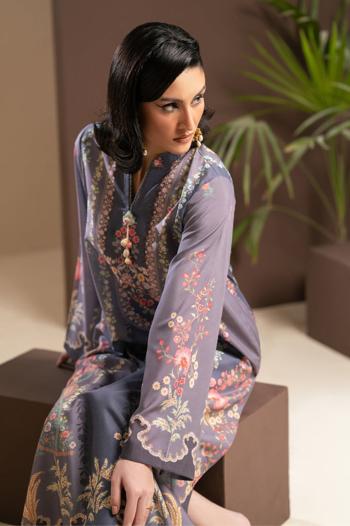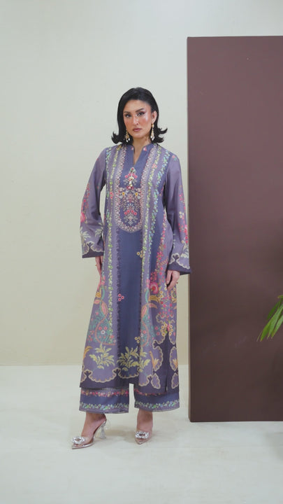 This ash grey printed kurta is inspired by french florals paired with printed izaar, finished with hand crafted tassels and laces.. This outfit can elevate your style this season.