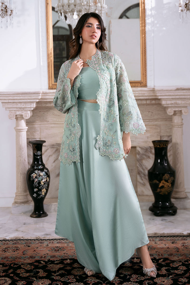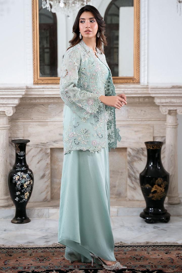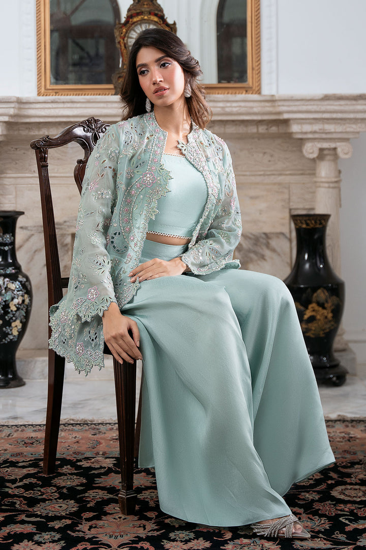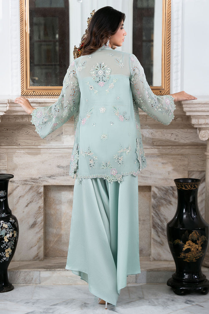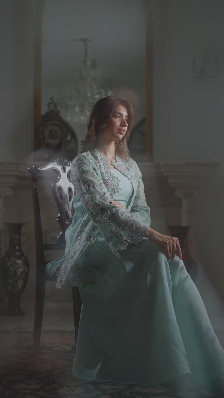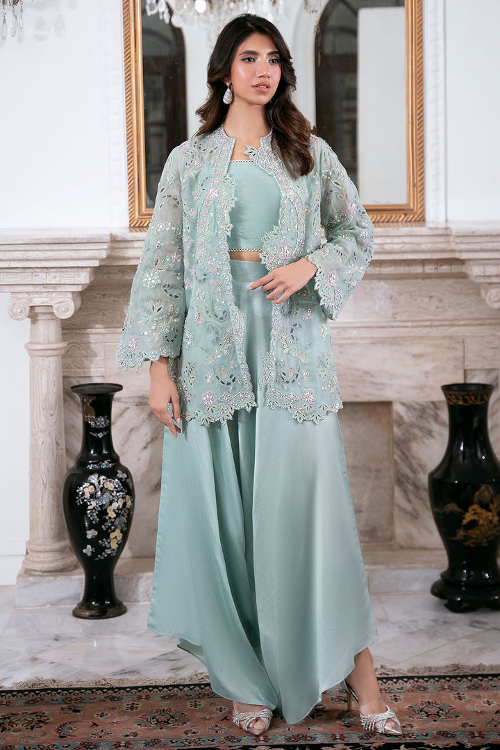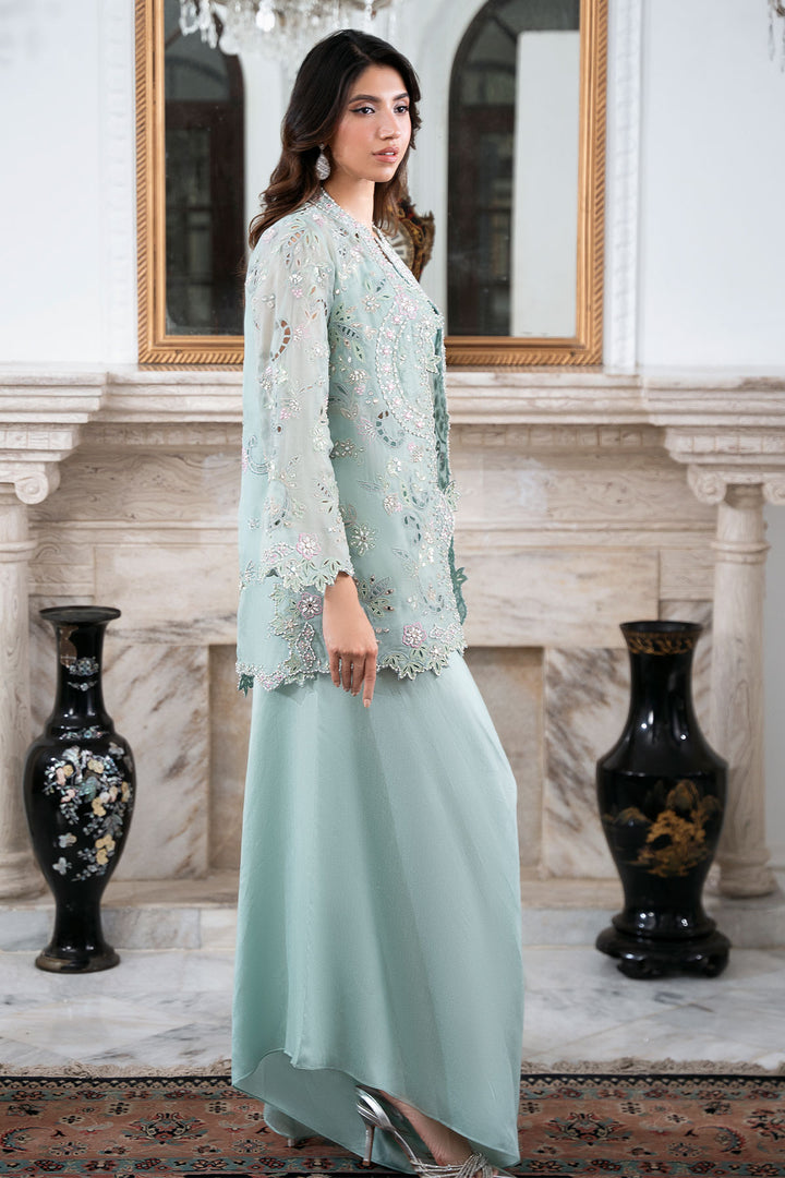 Command attention in this breathtaking Ice Blue organza cut-work jacket, richly detailed with fine hand work and brilliant mirrors. Worn over a coordinating blouse and paired with chic loose pants, this ensemble exudes radiant charm and chic style. This outfit is glamorous, striking, and absolutely perfect for making a memorable entrance.