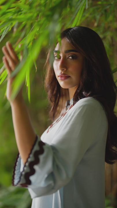 Cool, detailed, and chic. A striking blue short shirt with delicate lace detailing is paired with complementing embroidered culottes. It's the perfect statement outfit.