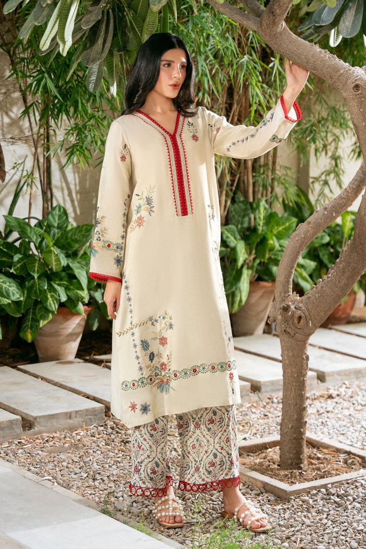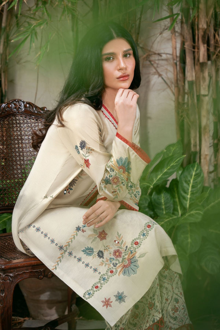 An intricately embroidered shirt detailed with dazzling mirror work and fine lace at the neck, paired with flowing printed culottes. All in a beautiful, understated beige.