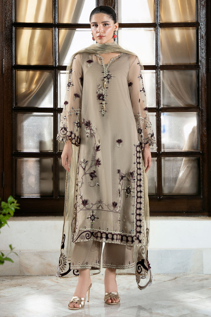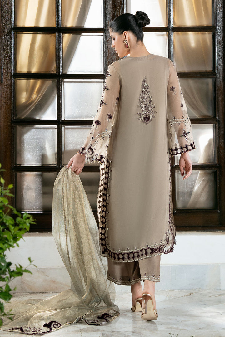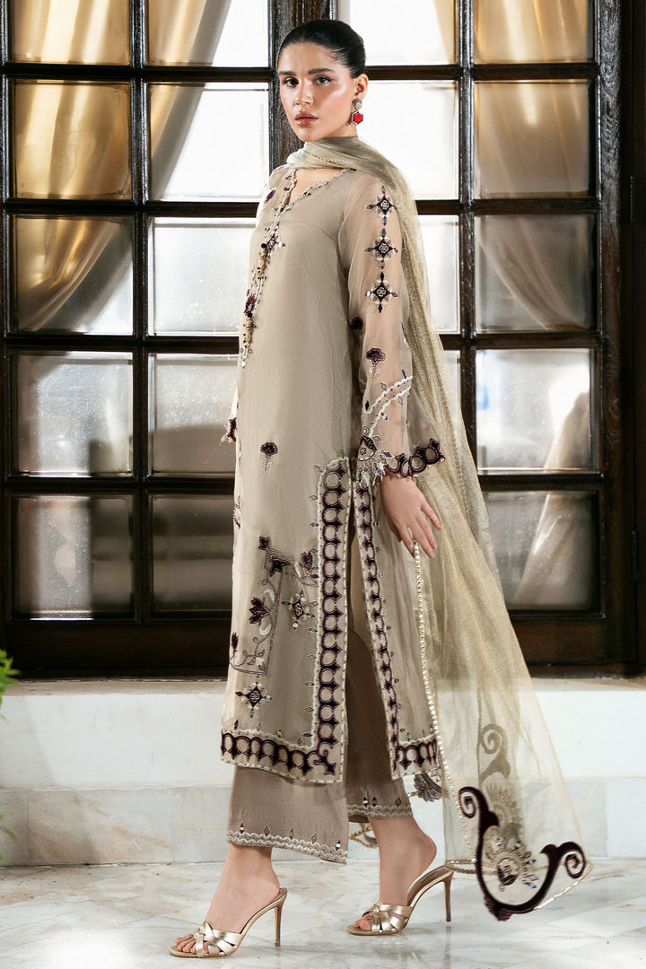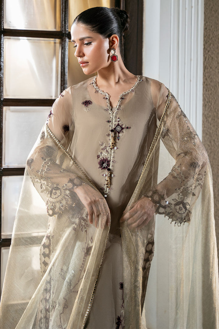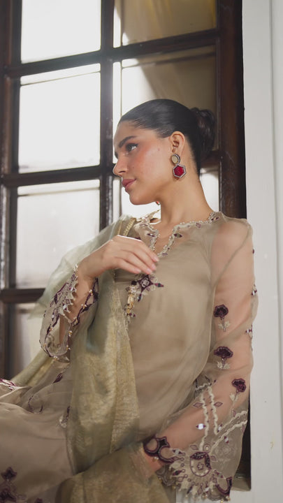 This breathtaking pure beige organza shirt is dramatically detailed with striking maroon velvet appliqué and luminous real mirror work. The sheer fabric contrasted with the plush texture creates a look of sheer luxury. This piece is a standout choice for formal dinners, or winter weddings.