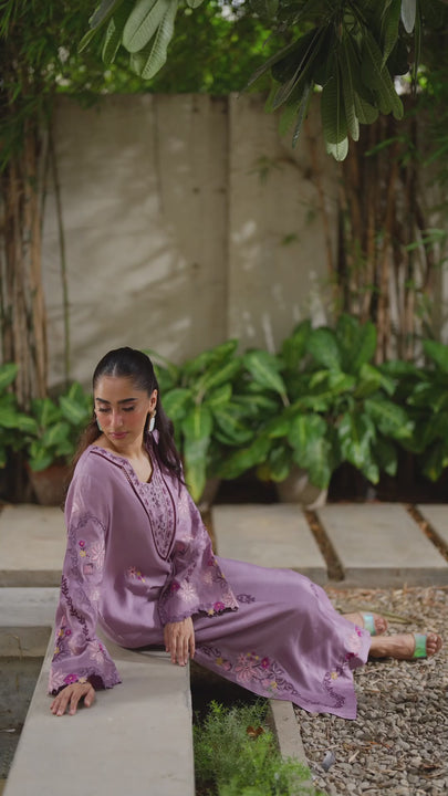 Elevate your winter wardrobe with the soft hue of lavender. The exquisite cutwork lace and embroidery on this long shirt paired with tailored culottes defines sophisticated comfort.