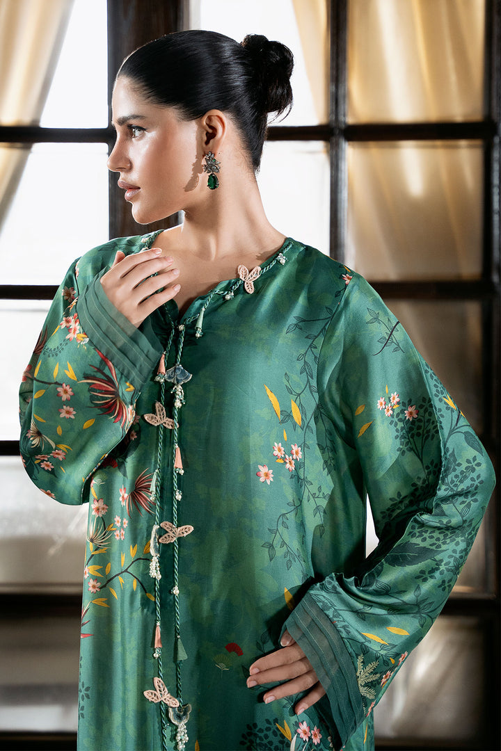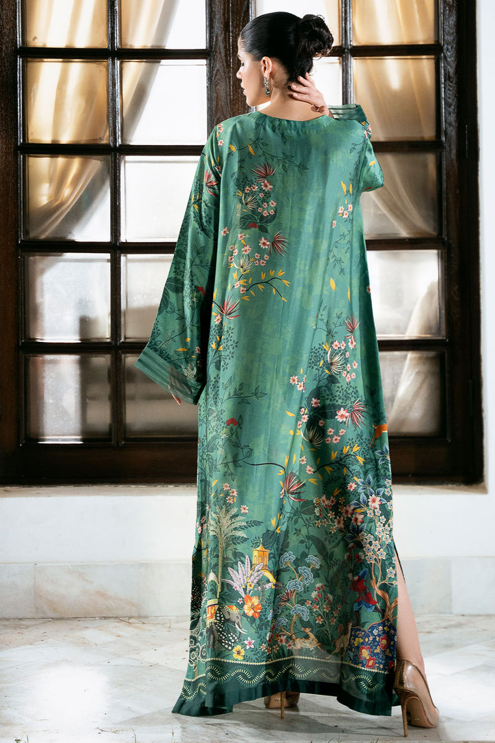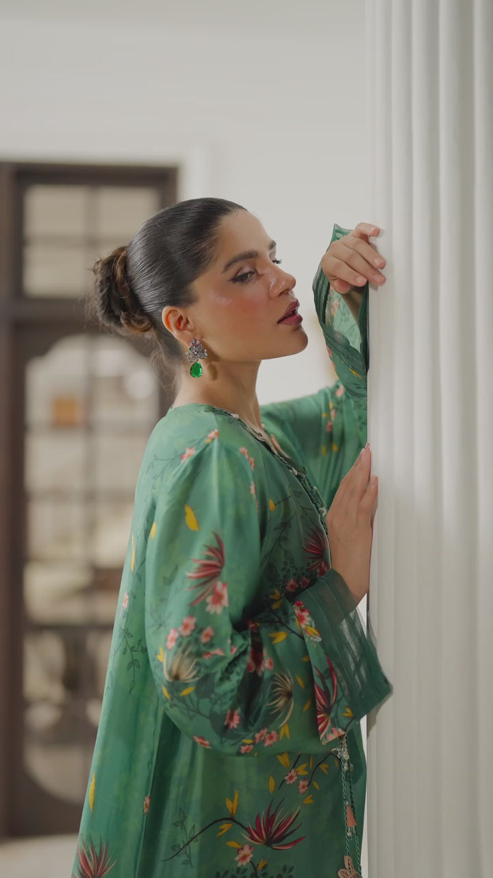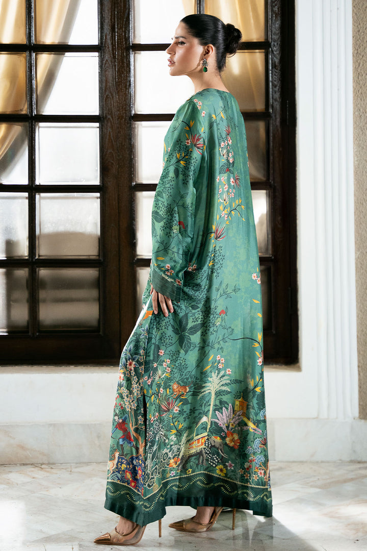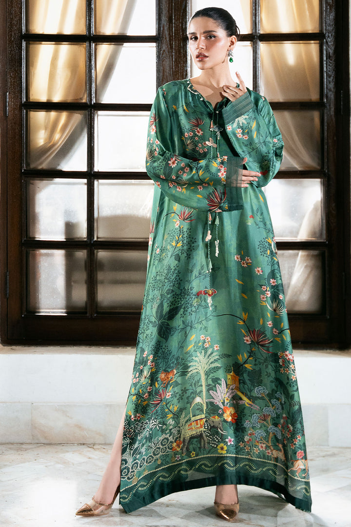 This stunning green kaftan features intricate patterns that beautifully blend regal Mughal motifs with vibrant tropical elements. A truly unique aesthetic that flows with grace.
