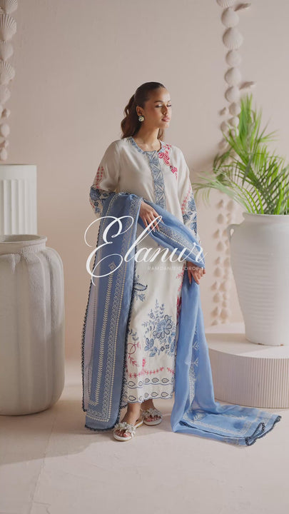 Experience the epitome of ethereal sophistication in this pristine White ensemble, where classic romance meets contemporary flair. The shirt features delicate French flower embroidery meticulously layered with cancan net details to create a stunning architectural volume and whimsical texture. Paired with a signature block-print dupatta finished with trim