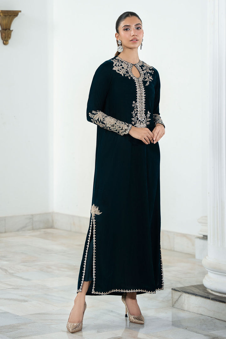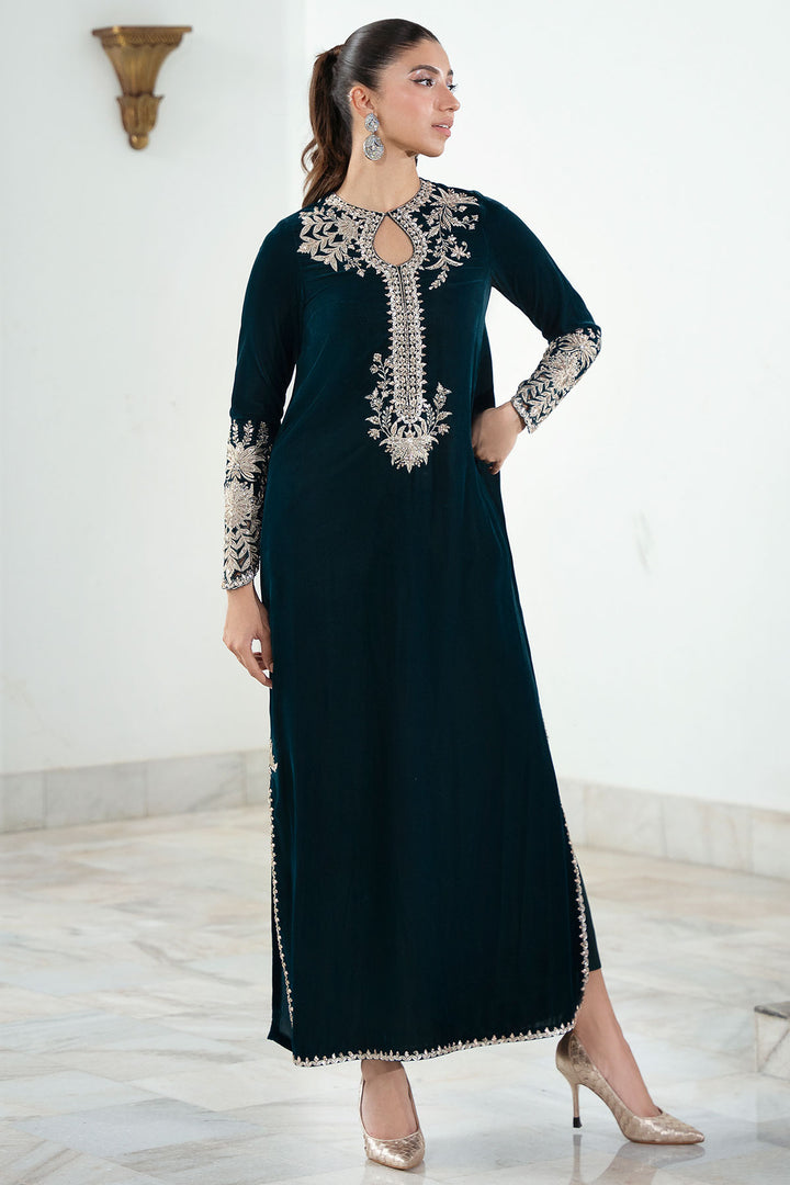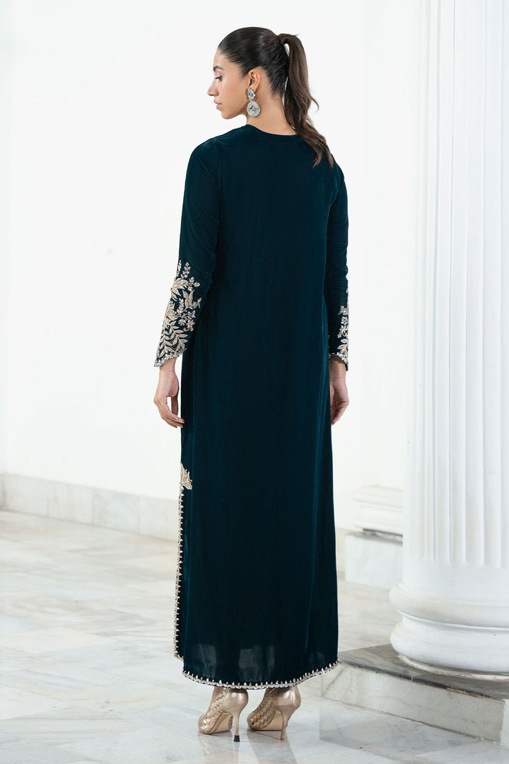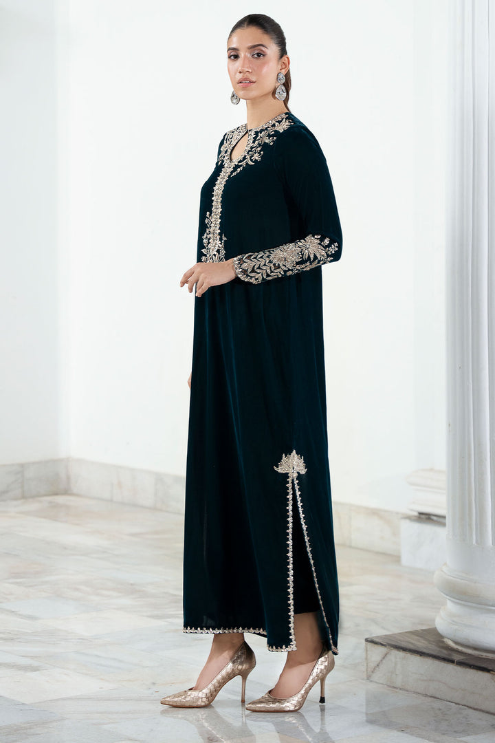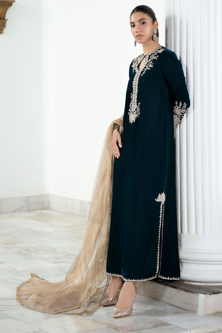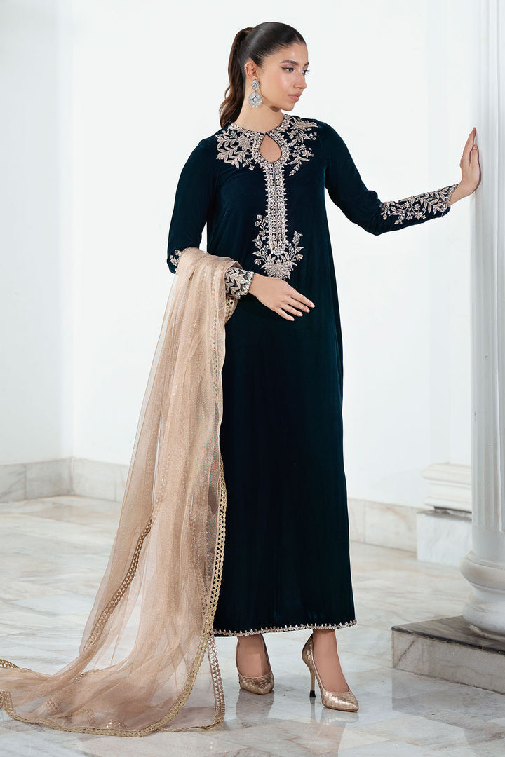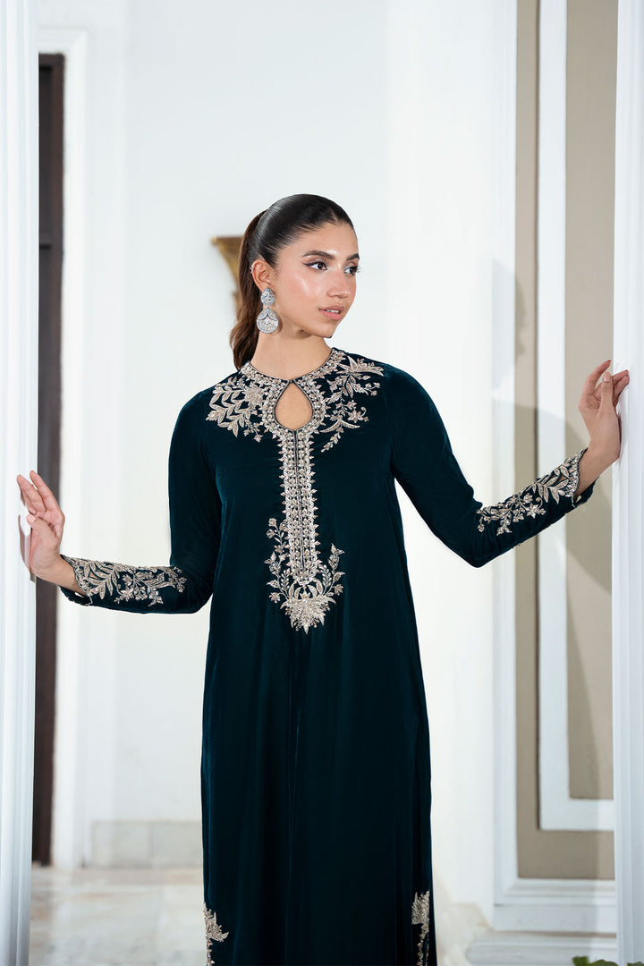 This stunning teal velvet long shirt is pure luxury, draped in plush fabric and adorned with intricate tissue silk appliqué and handwork. Paired with a shimmering zari net dupatta, this ensemble is ready to steal the spotlight at any winter wedding or formal event. The ultimate statement piece.