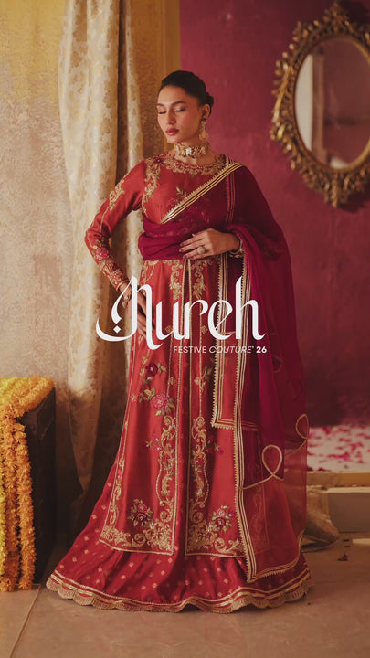 The pure silk front-open bodice features intricate baroque motifs, 3D flowers, and exquisite zardozi work, complete with hanging tassels on the side slits. Paired with a rich jacquard lehenga with gota lace finishings and a stunning two-colored organza dupatta, this look is perfect for making a statement at any grand occasion.