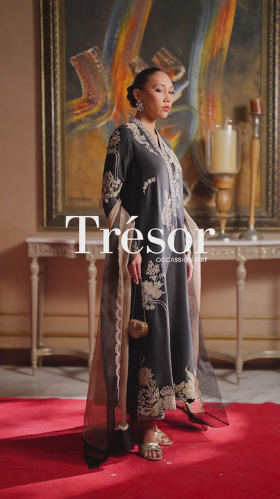 A masterpiece of contrast. This ensemble features rich Satin Black canvases brought to life with bronze-toned organza appliqué, Hand-embellished with faceted beads for that diamond-like shimmer, alongside classic pearls and zardozi. Finished with a pearl-dusted pure organza dupatta and culottes featuring a signature hand-embellished border. This is luxury you can feel.