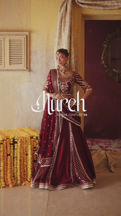 Make a statement in this regal maroon lehenga choli. The pure silk choli is a masterpiece, heavily embellished with mirrors, gota leaves, and flowers, complete with mirror-hanging tassels on the back. Paired with a rich maroon silk lehenga and a chiffon dupatta intricately worked with sequins and gota, this look is perfect for festive occasions.