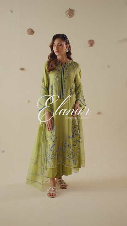 This ensemble features an olive green dyed over embroidered baroque theme shirt, masterfully blending classic opulence with modern design. The silhouette is elegantly elevated with organza cutwork finish on the borders, adding a layer of intricate texture and sophistication. The look is perfectly coordinated with an olive green dyed trouser and completed with a signature block print dupatta.