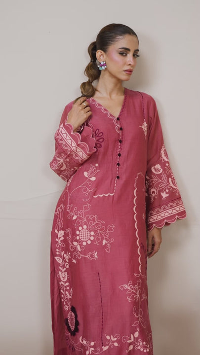 A rose-dust shirt featuring delicate screen print enhanced with machine embroidery. Folk-inspired motifs and button detailing add a touch of timeless charm.