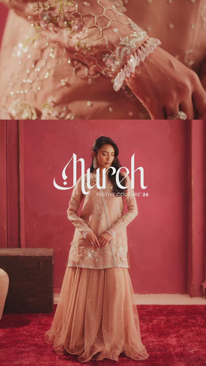 Step into refined style with this short embroidered choga in a beautiful shade of dusty pink, crafted with pure net and detailed with intricate artistry. Adorned with 3d work. This ensemble is with a flowing Korean net lehenga perfect balance between modern elegance and timeless tradition, making it a standout choice for any occasion.