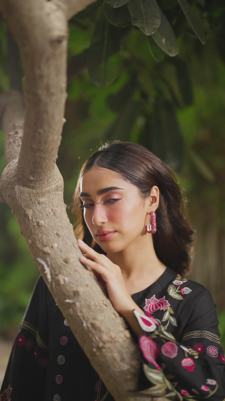 Elevated and chic, this head-to-toe black ensemble features intricate floral embroidery on both the short shirt and the flowing culottes.