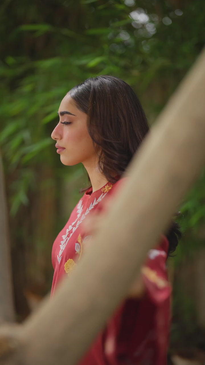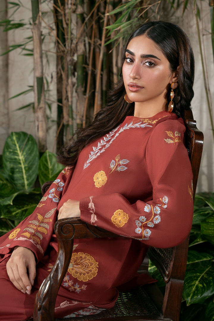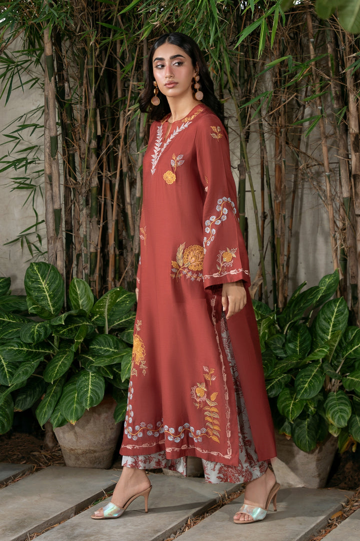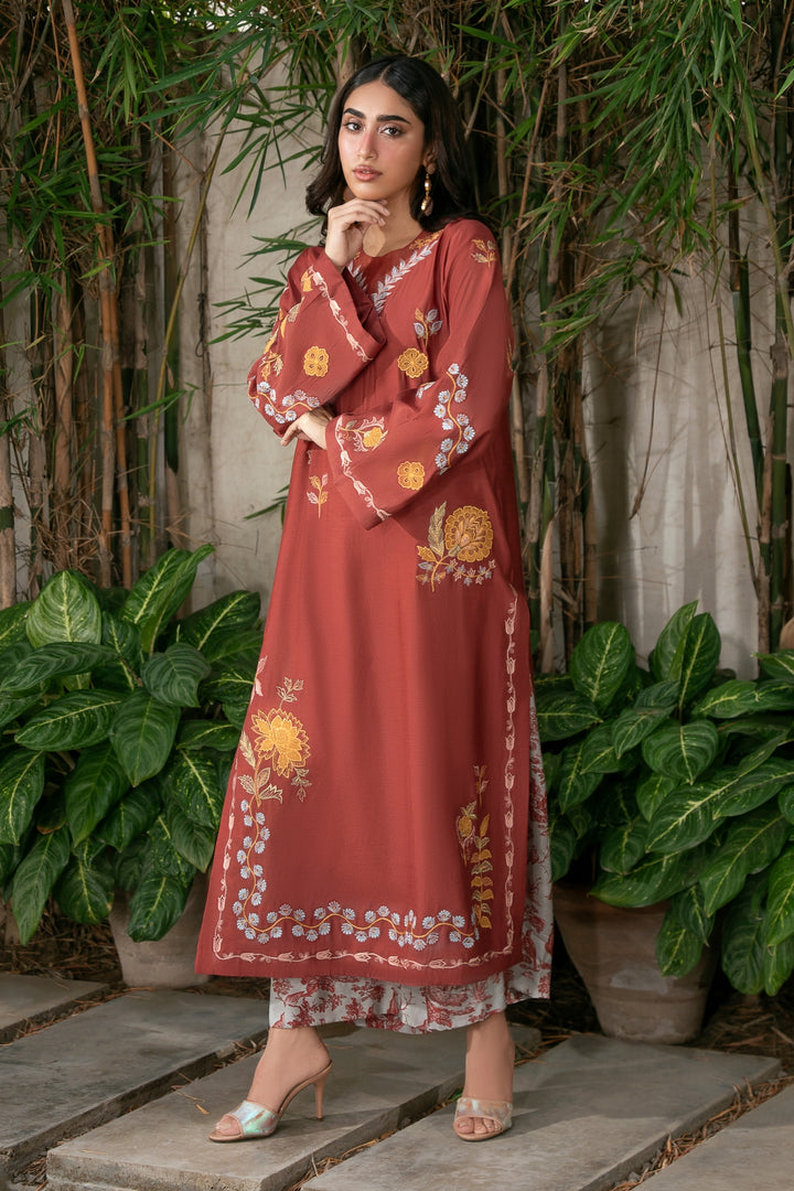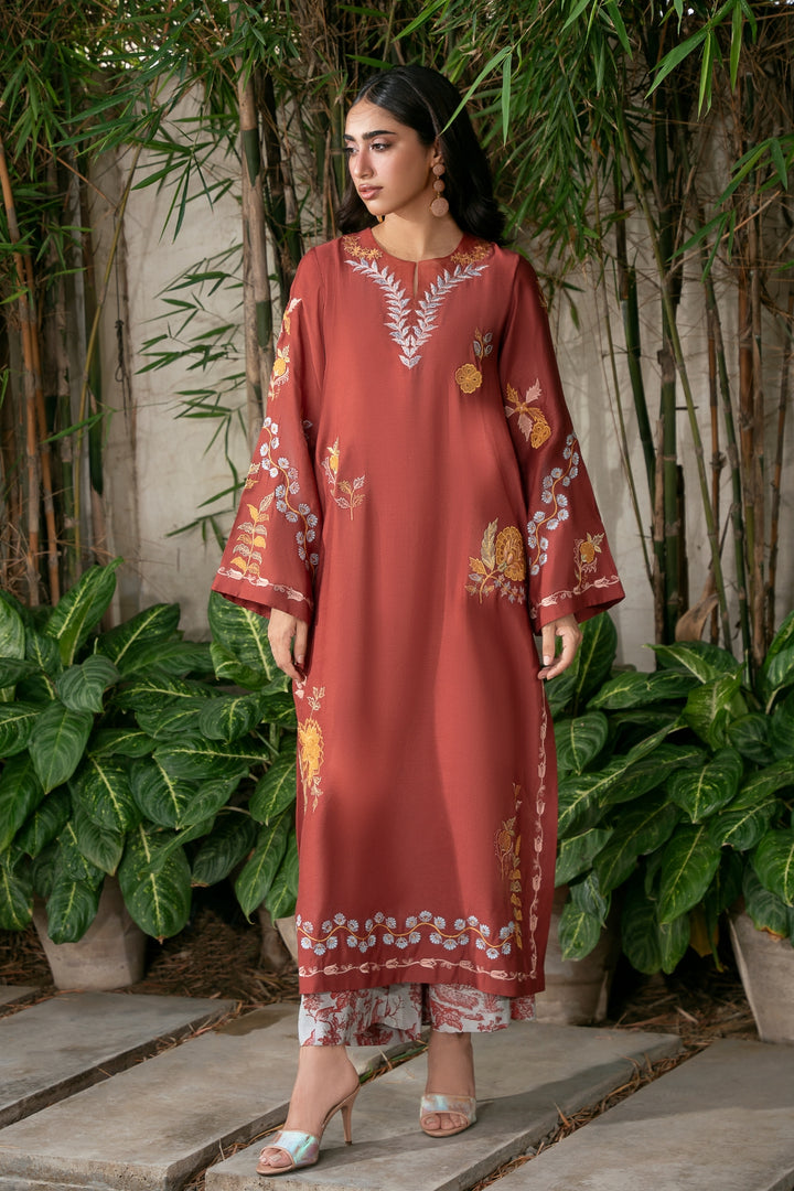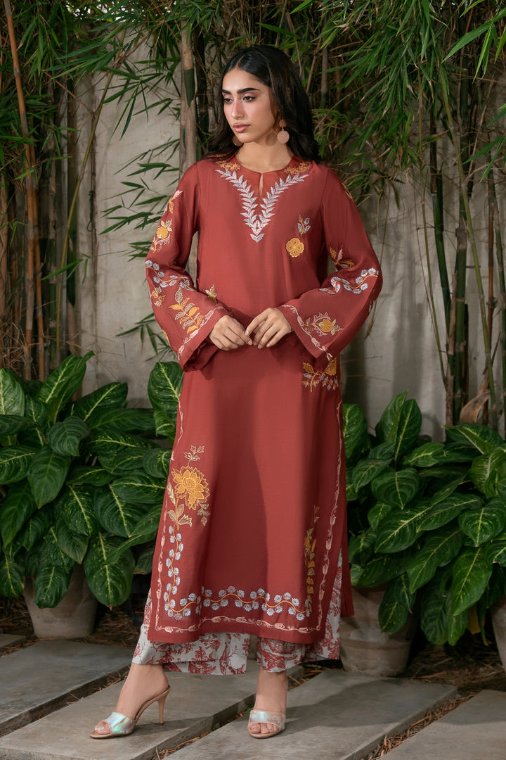 This rust-coloured ensemble—featuring a detailed embroidered shirt and playful printed culottes—is your new winter essential.