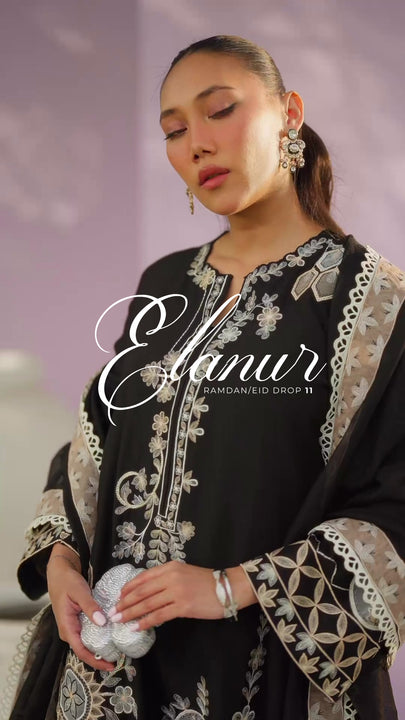 Make an elegant statement in classic black, featuring striking asymmetrical Egyptian-inspired embroidery layered with tonal organza appliqué. This standout shirt is paired with a precision-crafted black izaar and an embroidered dupatta finished with delicate lace for a sharp, curated look.