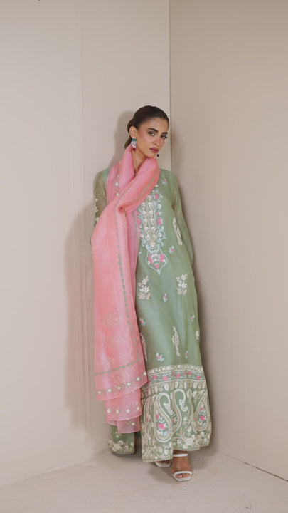 Intricate paisley patterns brought to life with Ari embroidery on a rich green canvas — perfect for festive and formal occasions.