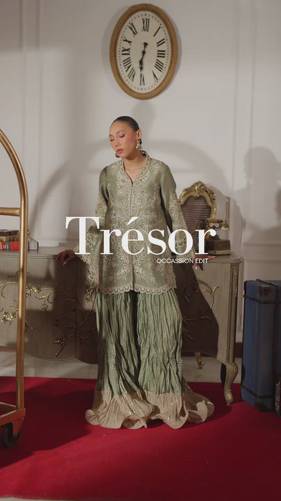 Turn heads in our signature Aari embroidered jacket, featuring delicate organza appliqués and high-impact blingy hand work that captures every ray of light.The drama continues with a crushed Dhaka for that vintage-inspired volume, finished with a shimmering Lurex boti border. It’s heritage craft, reimagined for the modern trendsetter.
