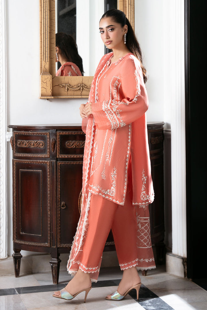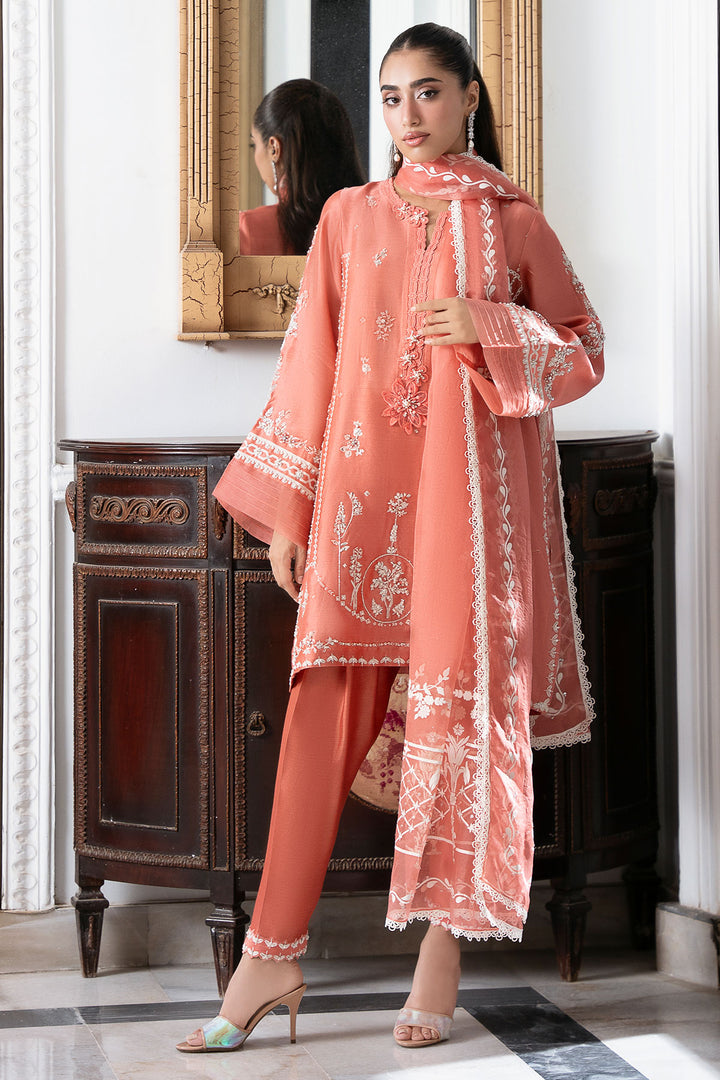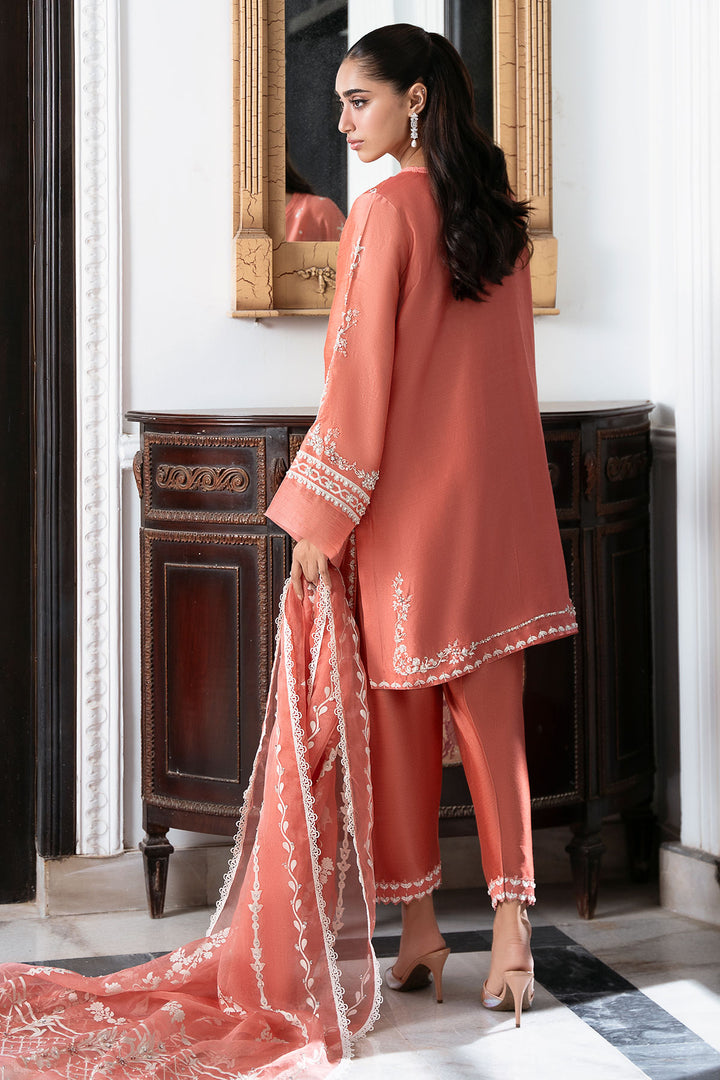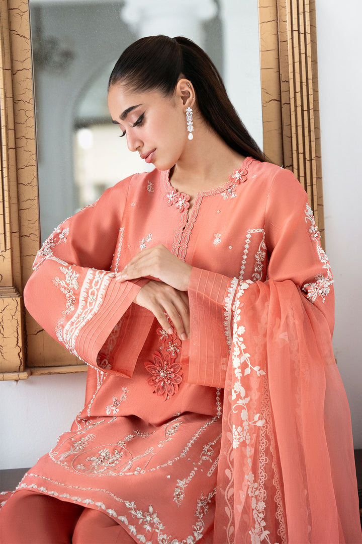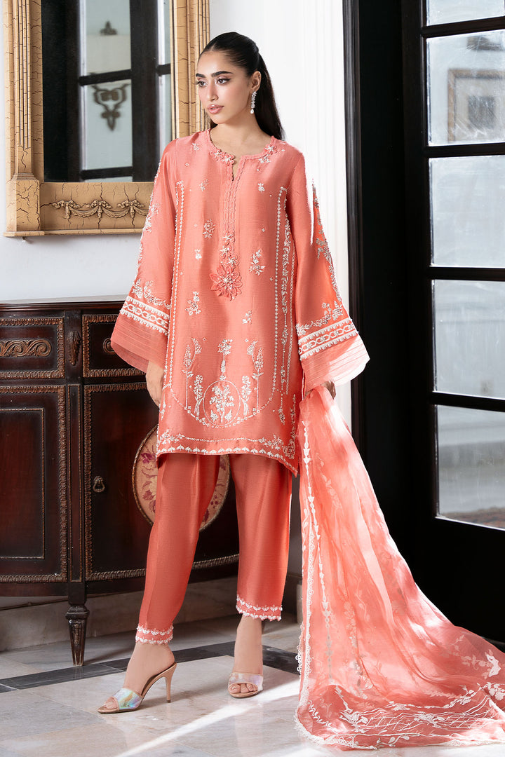 This coral screen-print shirt is an absolute delight, embellished with delicate hand work that highlights the beautiful design. Paired with a comfortable shalwar and a matching screen-printed dupatta that also features elegant hand work, this ensemble is a flawless blend of striking colour and intricate detail. It's a look that’s both traditional and stunningly fresh.