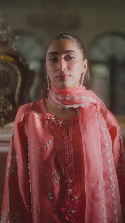 This coral screen-print shirt is an absolute delight, embellished with delicate hand work that highlights the beautiful design. Paired with a comfortable shalwar and a matching screen-printed dupatta that also features elegant hand work, this ensemble is a flawless blend of striking colour and intricate detail. It's a look that’s both traditional and stunningly fresh.