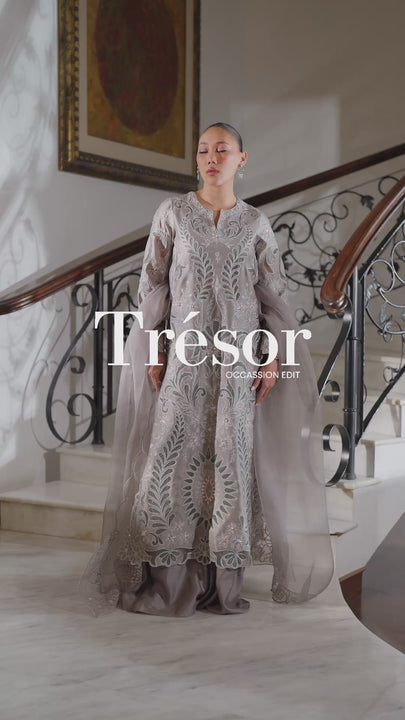 Experience the sheer artistry of tonal textures. This ensemble features masterful Aari embroidery layered with delicate organza appliqué, further elevated by the shimmering trio of pearls, sequins, and zardozi. Complete with a gossamer pure organza dupatta and a regal Dhaka pant silhouette, it’s a look designed for the modern heirloom collector.