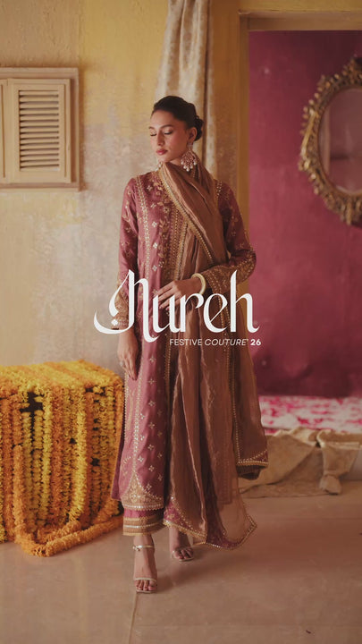 Intricately handcrafted with traditional Marori embroidery, shimmering sequins, and rich maroon accent details. Enhanced with delicate tissue appliqué and paired with a pure Marori-embroidered tissue dupatta. Finished with elegant culottes detailed with refined gold edgings.